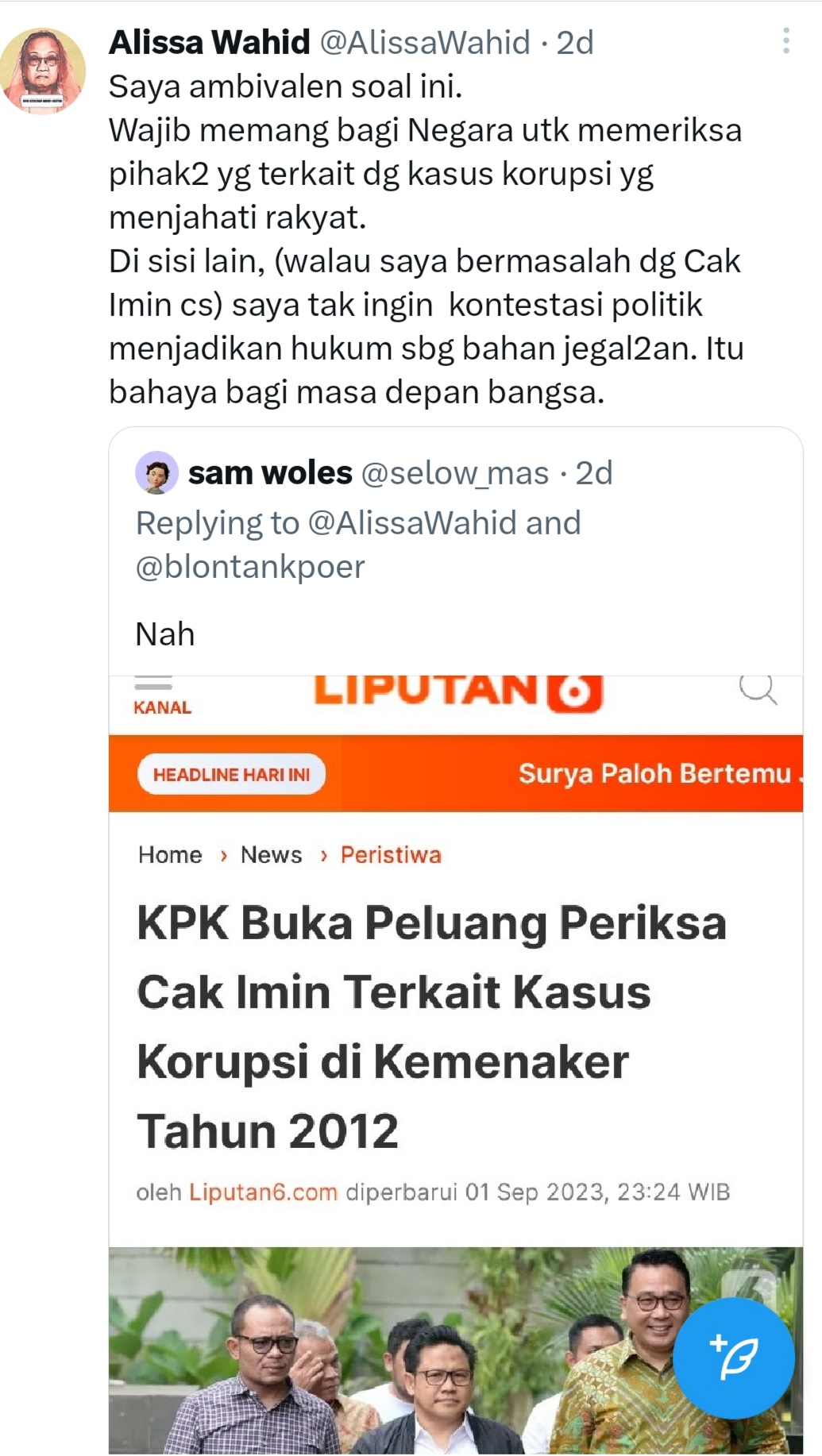 “Di sisi lain, (walau saya bermasalah dengan Cak Imin cs) saya tak ingin kontestasi politik menjadikan hukum sebagai bahan jegal-jegalan. Itu bahaya bagi masa depan bangsa,” cuit Alissa pada Minggu, (3/09/2023).  (Amr-untuk Indonesia)