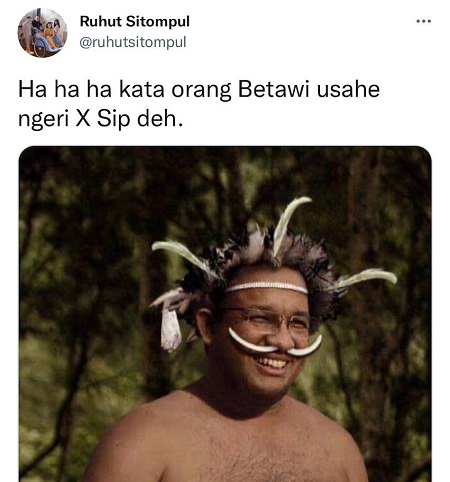 Ruhut Sitompul mengunggah gambar Anies mengenakan pakaian adat suku Dani pada Rabu (11/5/2022) sekitar pukul 14.42 WIB. "Ha ha ha kata orang Betawi usahe ngeri X Sip deh," demikian dikutip dari unggahan @ruhutsitompul.