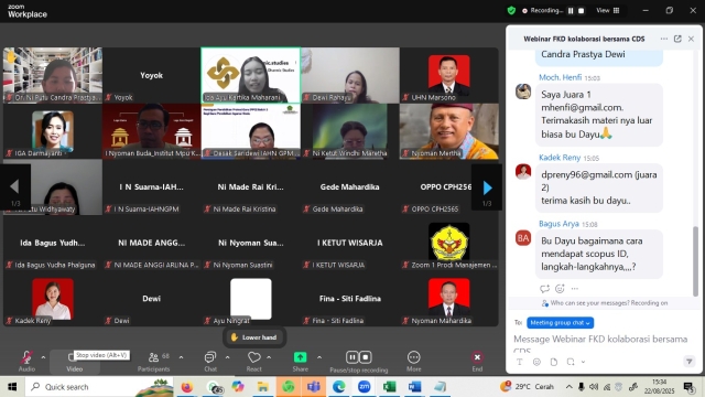 Dr. Ni Putu Gatriyani, S.Pd., M.Pd. H. selaku Ketua Forum Komunikasi Dosen (FKD) Bali menyampaikan rasa syukur dan apresiasi atas terlaksananya kerjasama antara FKD Bali dengan Center for Darmic Studies (CDS). “Melalui webinar bertajuk Tips Menulis Artikel Ilmiah Tembus Jurnal Bereputasi Tinggi, kami berkomitmen memberikan ruang pembelajaran yang strategis bagi dosen, peneliti, dan mahasiswa untuk meningkatkan kualitas publikasi ilmiah.” pungkasnya.