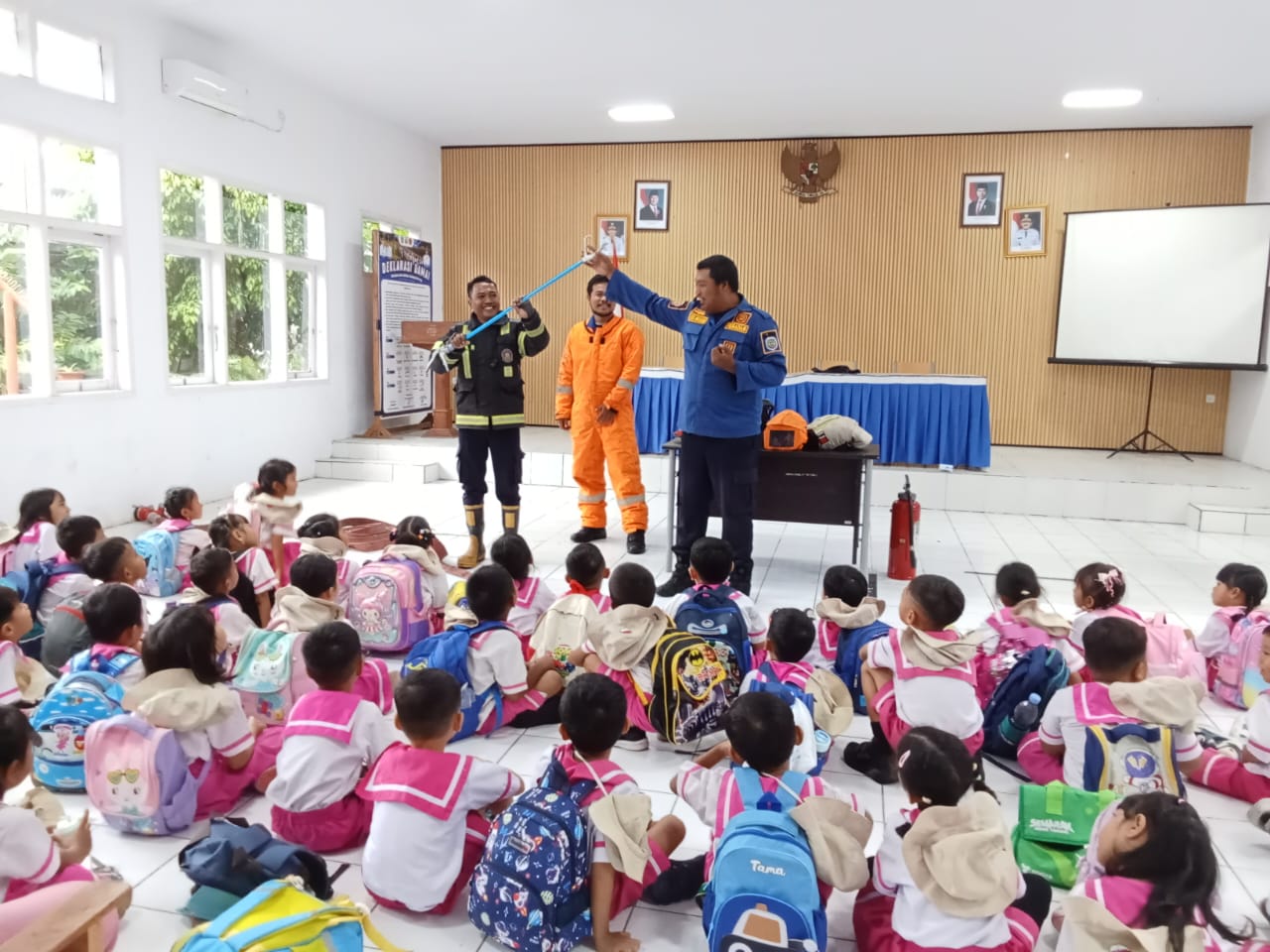 Kemudian pada jam 9.30 WIB mereka disambut oleh wajah ramah petugas pemadam kebakaran kemudian setelah perkenalan para Tunas PAUD diberikan berbagai pengetahuan mengenai berbagai peralatan keselamatan yang kerap digunakan saat bertugas memberikan pelayanan pertolongan saat ada yang membutuhkan, pakaian khusus pemadam menjadi ajang bagi para Tunas untuk melihat lebih dekat sosok gagah dan berani para pejuang kebaikan dari balik seragam,kemudian kegiatan dilanjutkan dengan atraksi serta pemahaman akan bahaya bila bermain api.